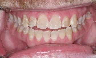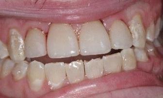 Patient had severely decayed teeth due to drinking pop all day. We restored her to health with crowns, fillings, and an upper partial.
