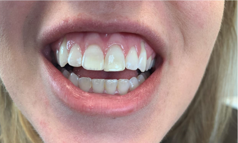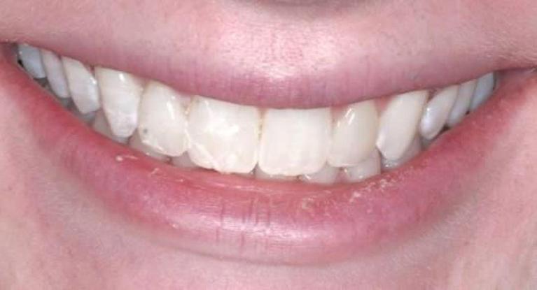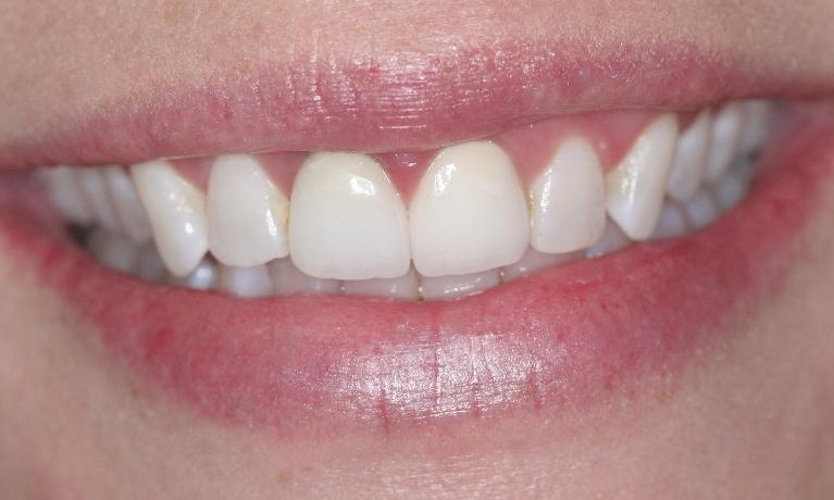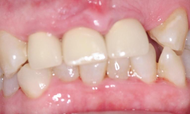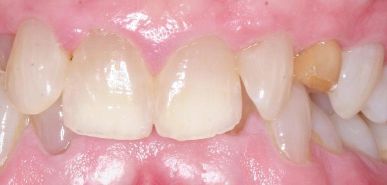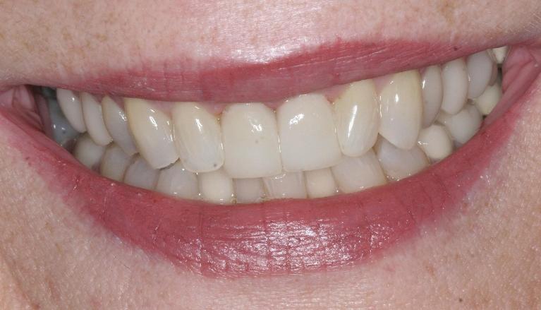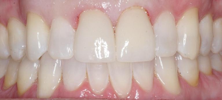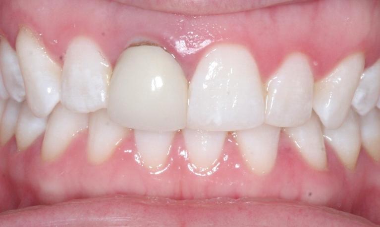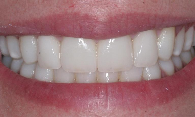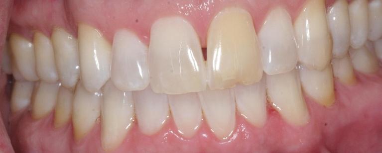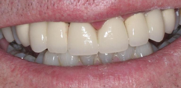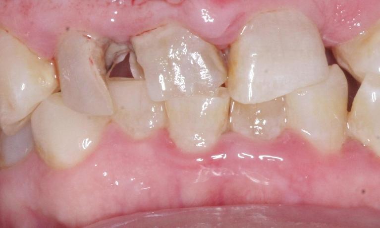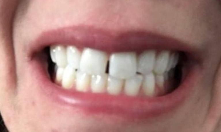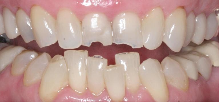 crowns were placed to protect front teeth from further breakage and to close the gap.