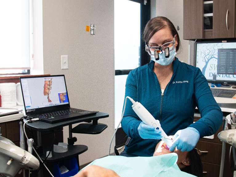 On the other hand, digital scanning simplifies the dental impression process and reduces the turnaround time to just a few short minutes. This is achieved with a small wand-like tool called an intraoral digital scanner. The intraoral scanner takes a 3D impression of your teeth and oral cavity using laser light. You can even watch the 3D model of your teeth being generated on screen with each pass of the wand until a highly accurate 3D model is complete.